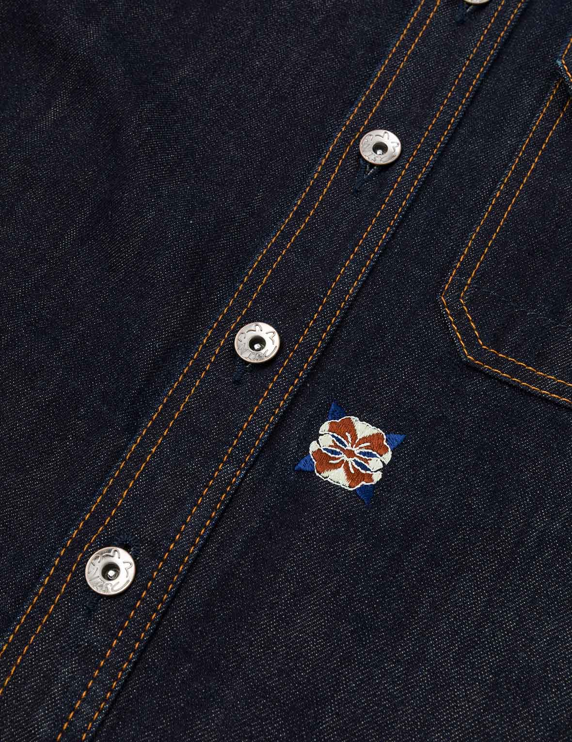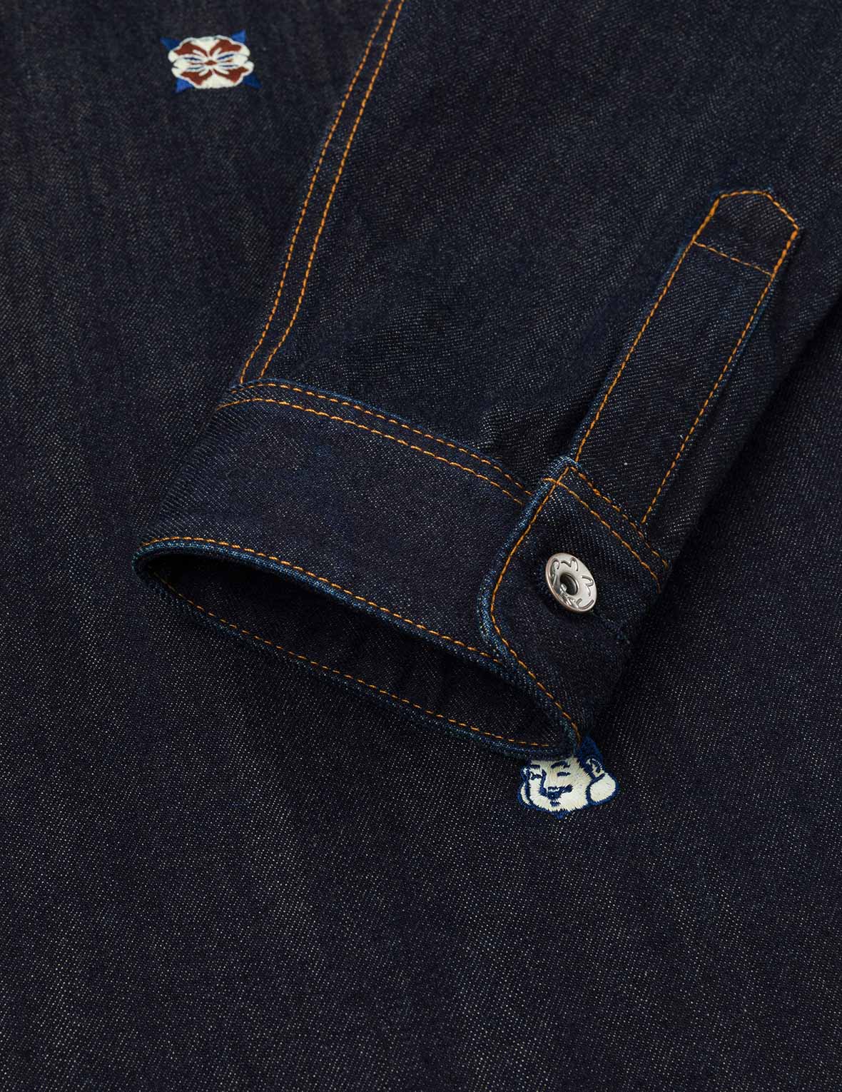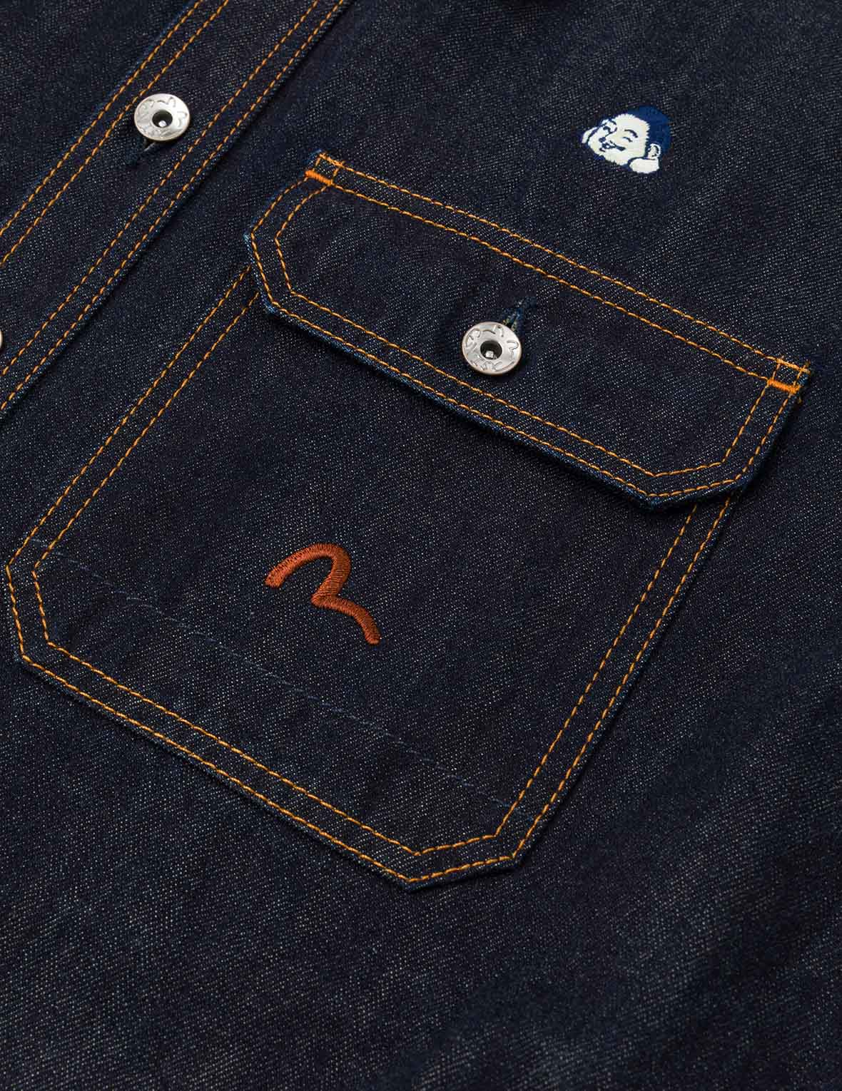 This denim shirt jacket showcases EVISU's exquisite craftsmanship with its unique playful theme and rich embroidery elements. The jacket is adorned with a variety of embroidered patterns, including the Godhead, Seagull, and Kamon, reflecting the brand's classic features and cultural significance while enhancing visual appeal and creativity