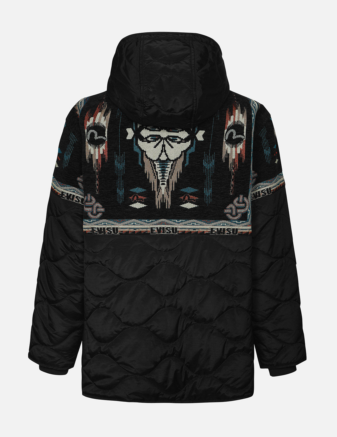 This stylish long hooded quilted outerwear is fashioned from plaid nylon and retro Chimayo woven cotton tapestry. The plush yarn of the tapestry gives the fabric an inviting warmth and layered richness. The design masterfully weaves in seagull and Kamon Chimayo motifs, complemented by intricate color palettes that captivate the eye, reflecting a unique artisanal charm.
