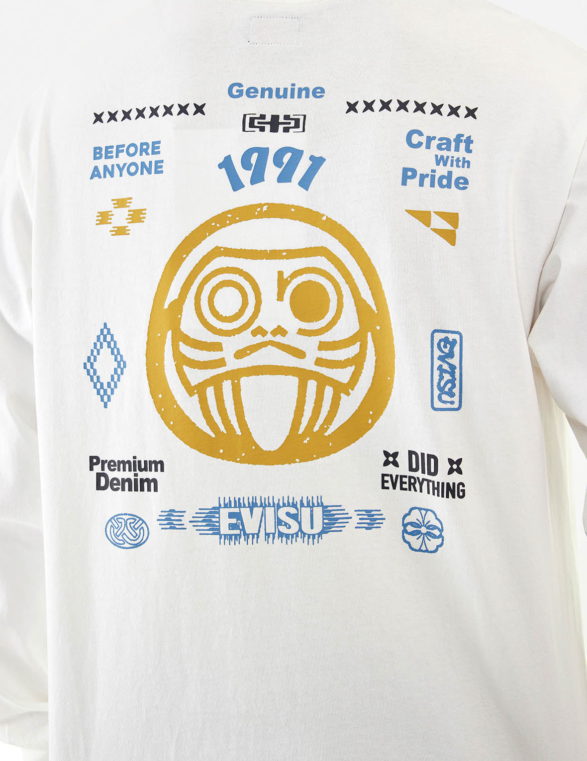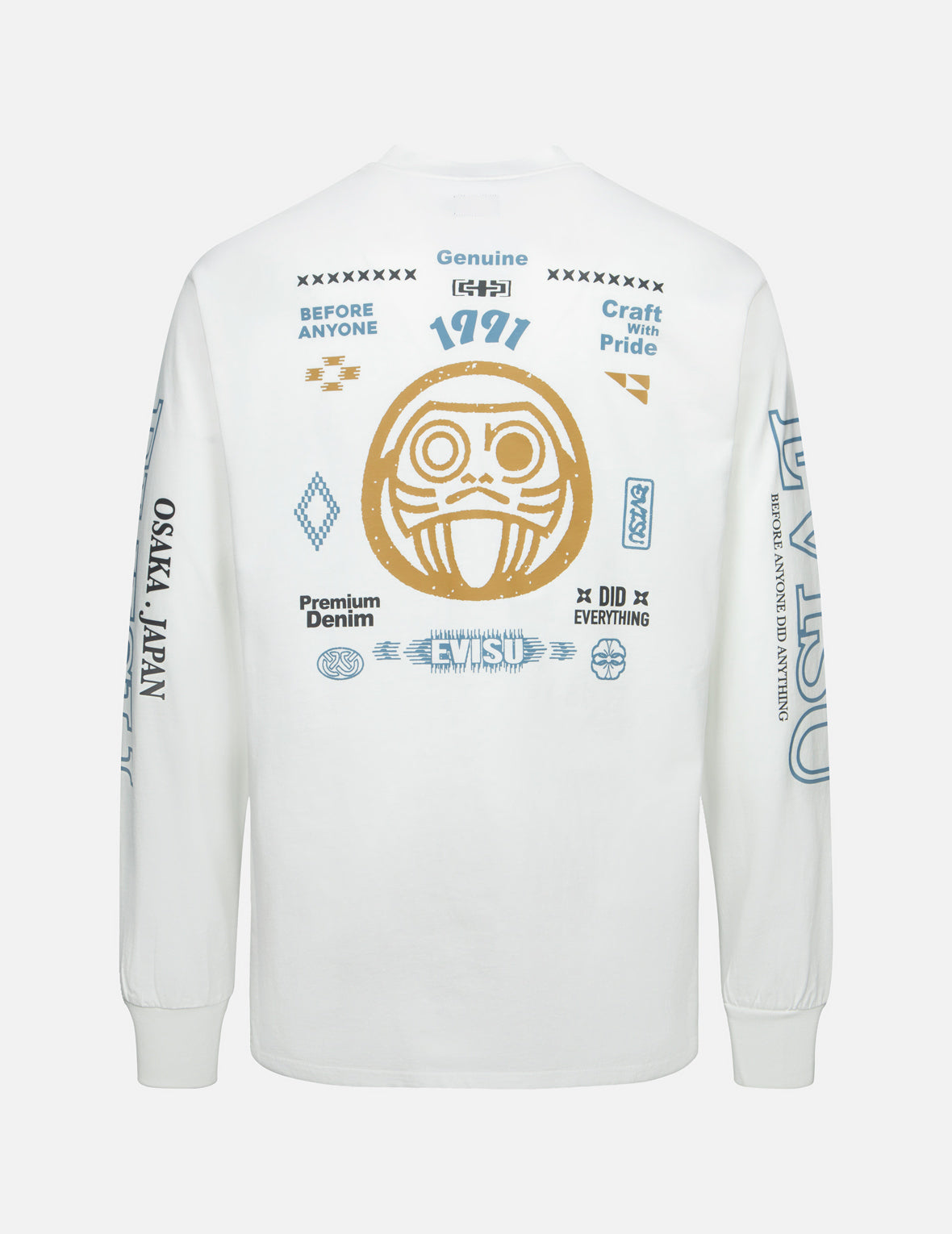 Blending laid-back comfort and eye-catching style, this t-shirt is a modern wardrobe essential. Crafted from soft fabric, it features the EVISU logo on the sides, while the back showcases a Daruma graphic and other signature designs that lend a spirited, energetic vibe.