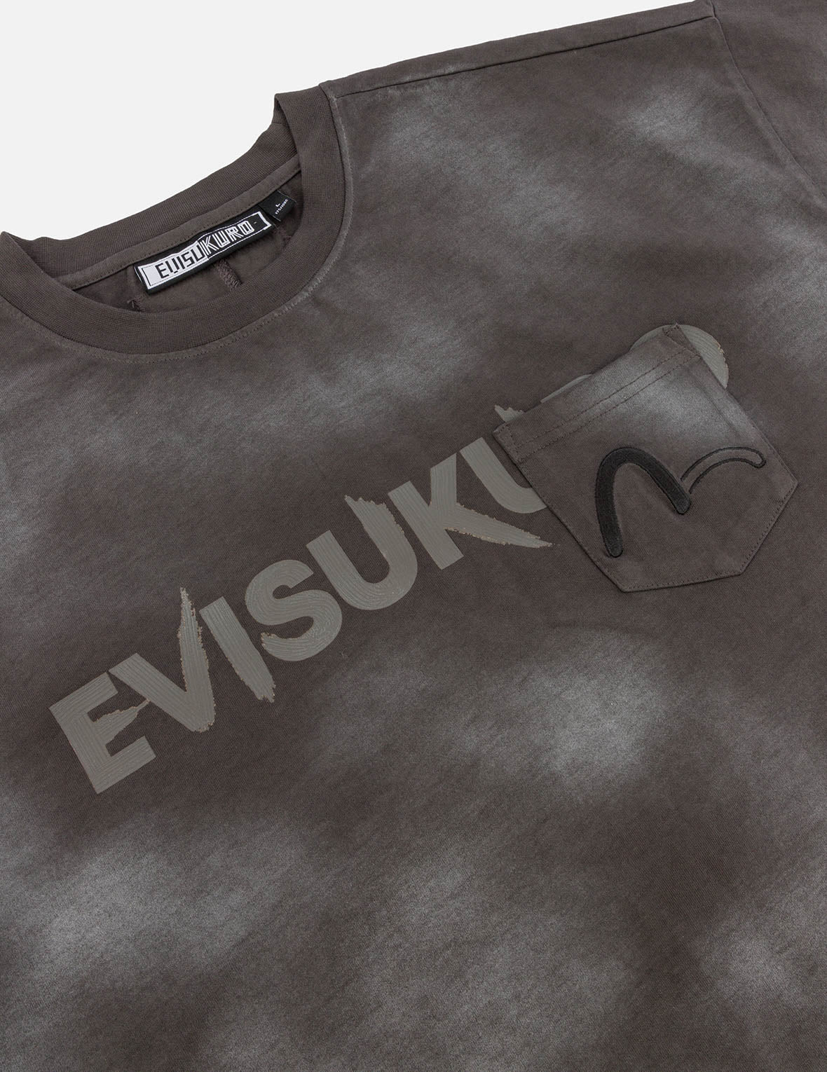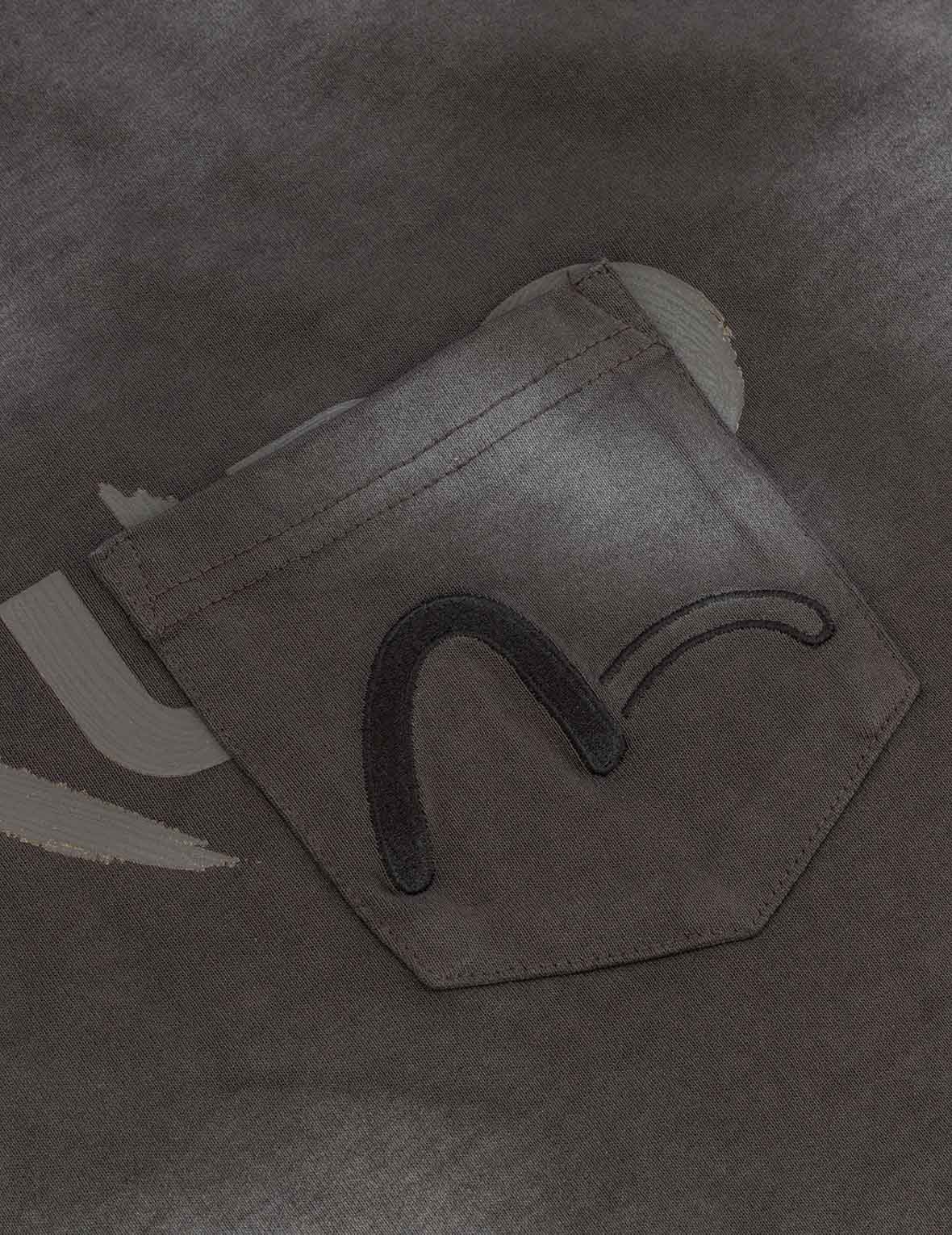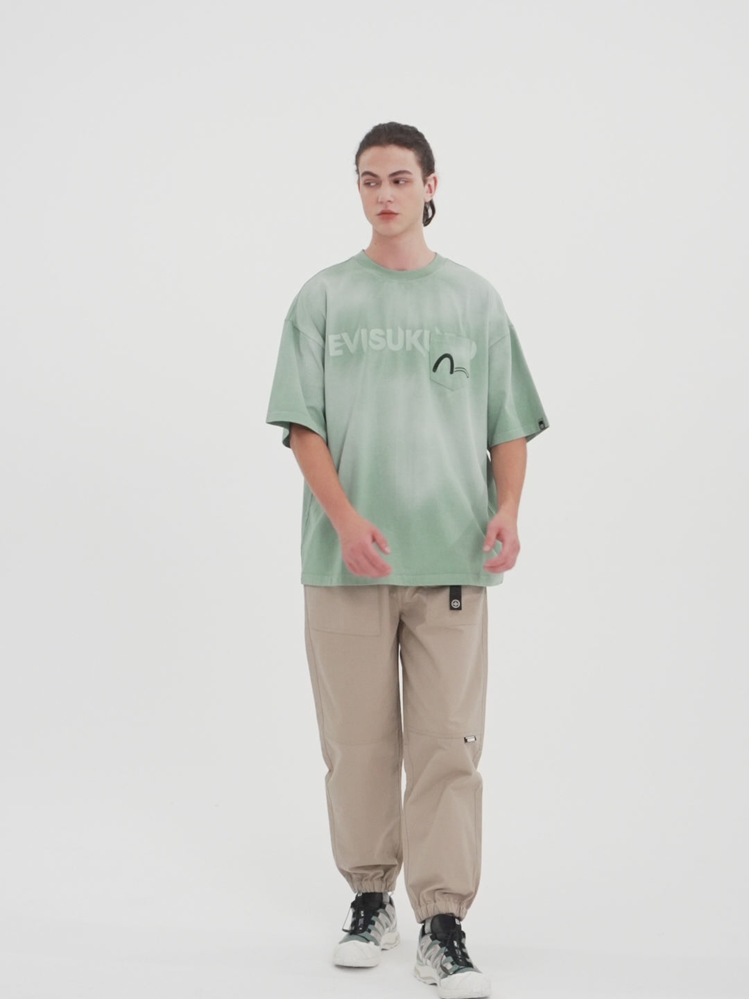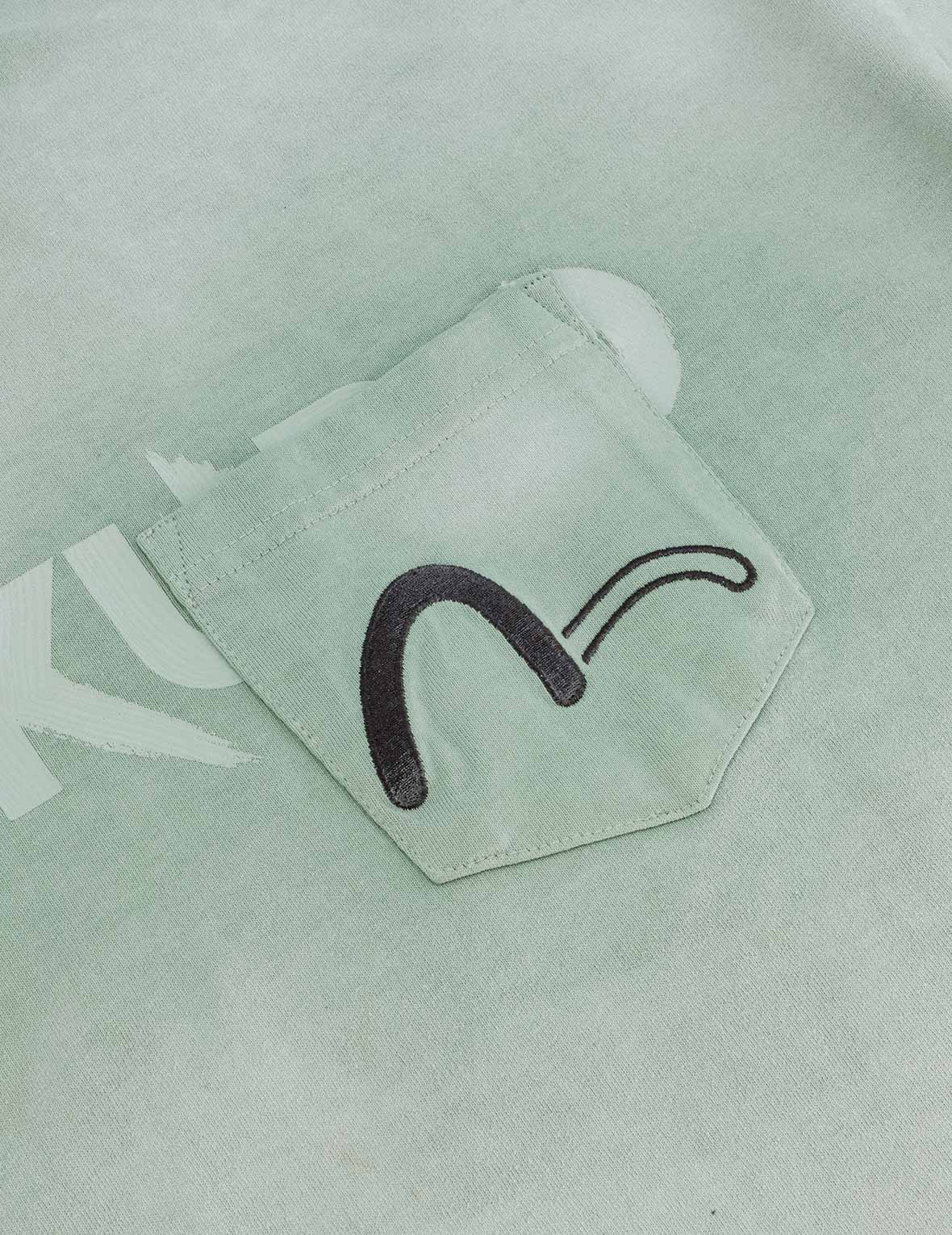 This T-shirt has undergone garment dyeing, adorned with a seagull embroidery on the front pocket, and featuring calligraphy-style logo prints on the front and back, imparting a unique texture to the garment. The design merges traditional and modern elements, showcasing a distinctive style.