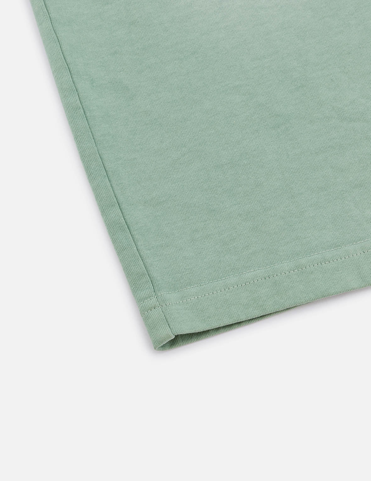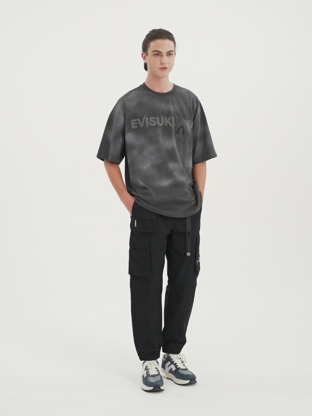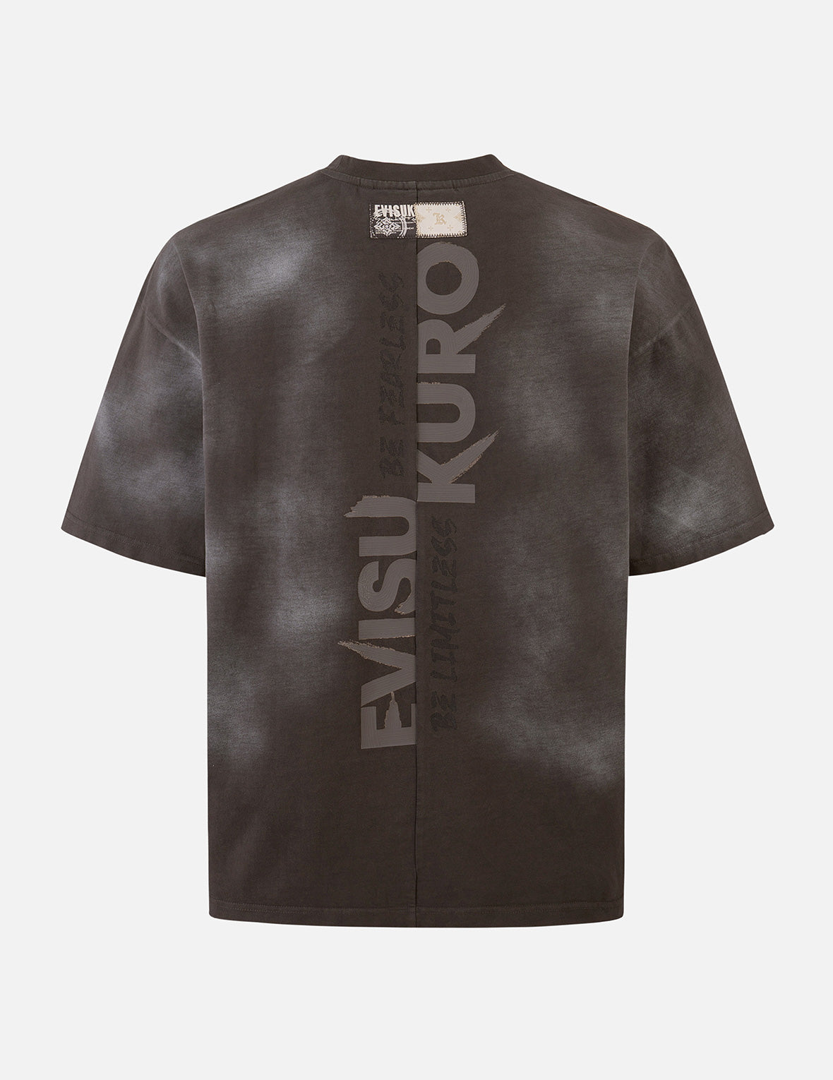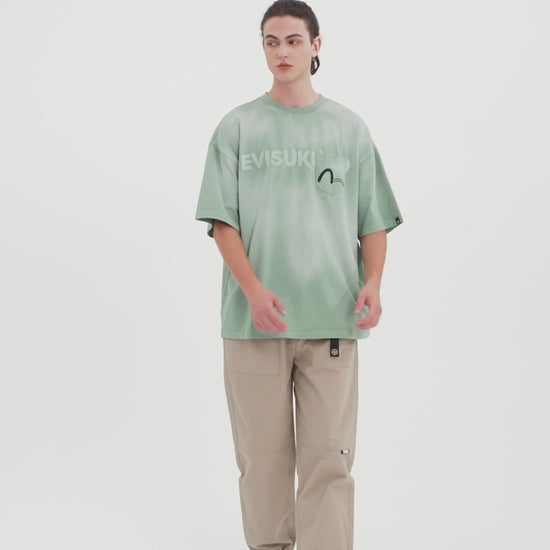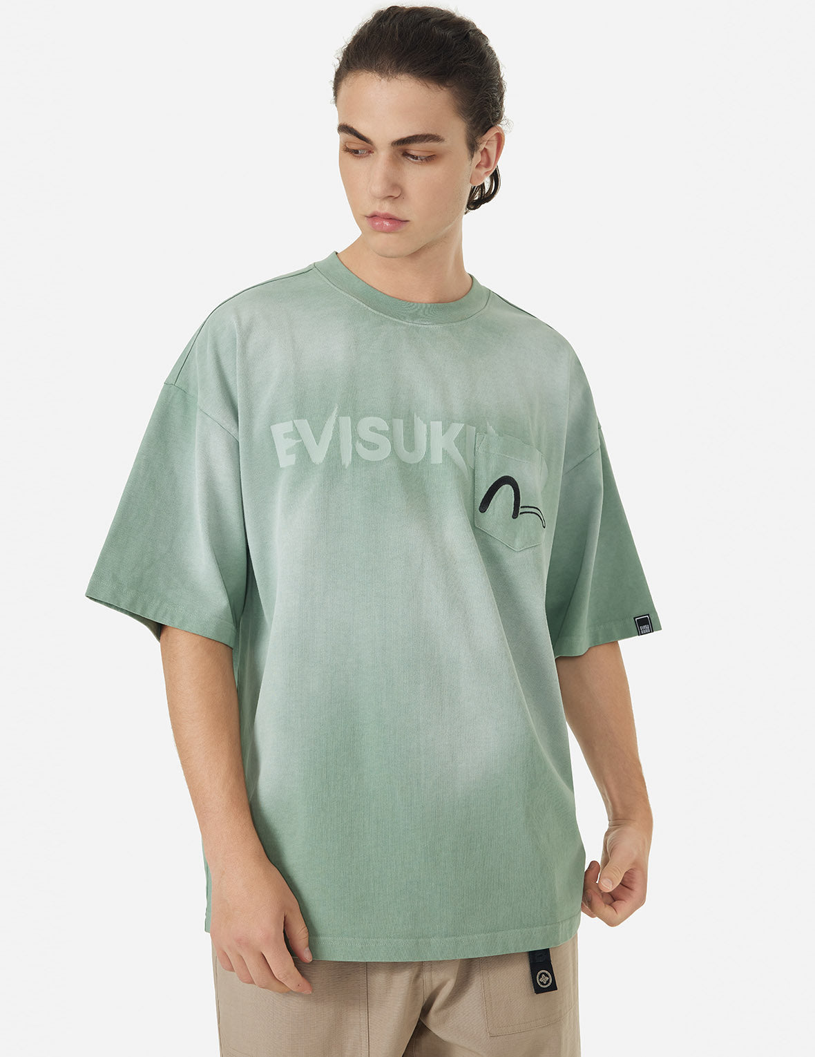 This T-shirt has undergone garment dyeing, adorned with a seagull embroidery on the front pocket, and featuring calligraphy-style logo prints on the front and back, imparting a unique texture to the garment. The design merges traditional and modern elements, showcasing a distinctive style.