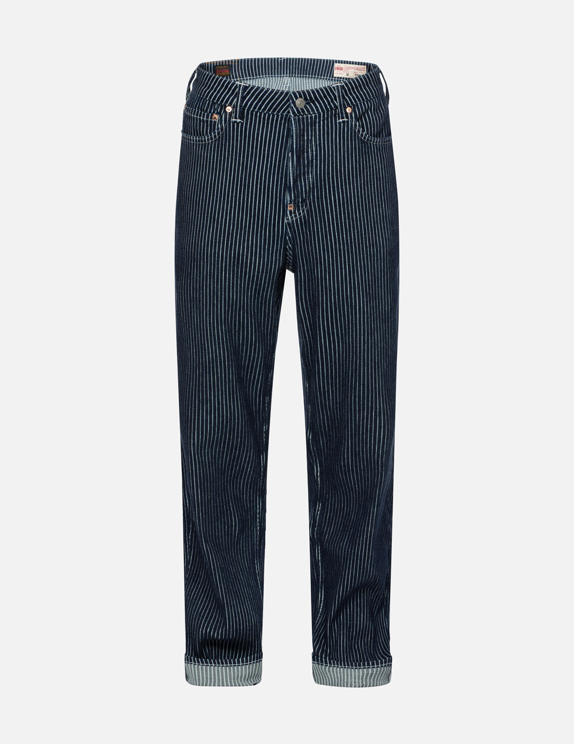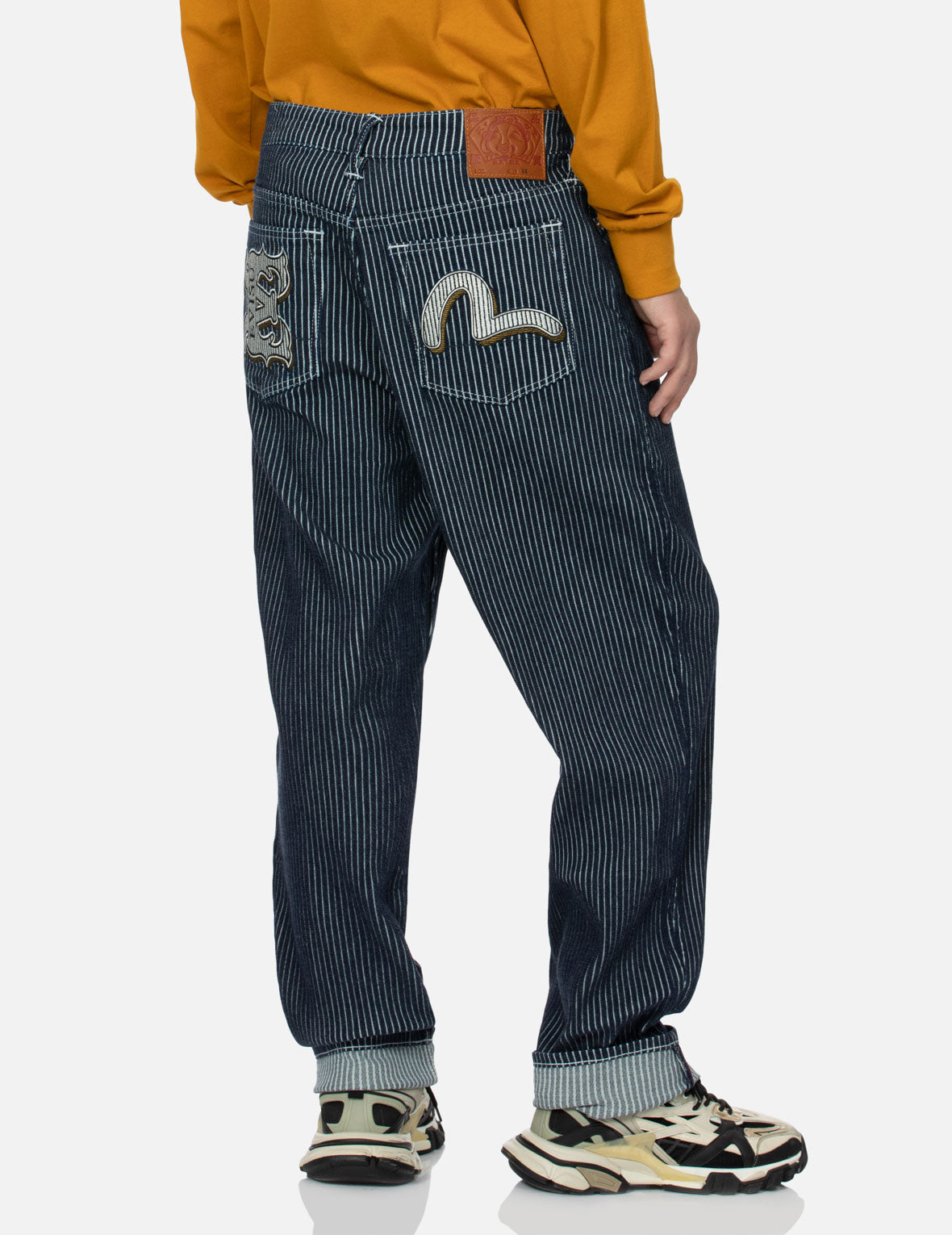 EVISU stands out by incorporating a corduroy stripe design in these jeans, with 3D Seagull and logo embroideries on the back, combining classic elements with a touch of fashion.