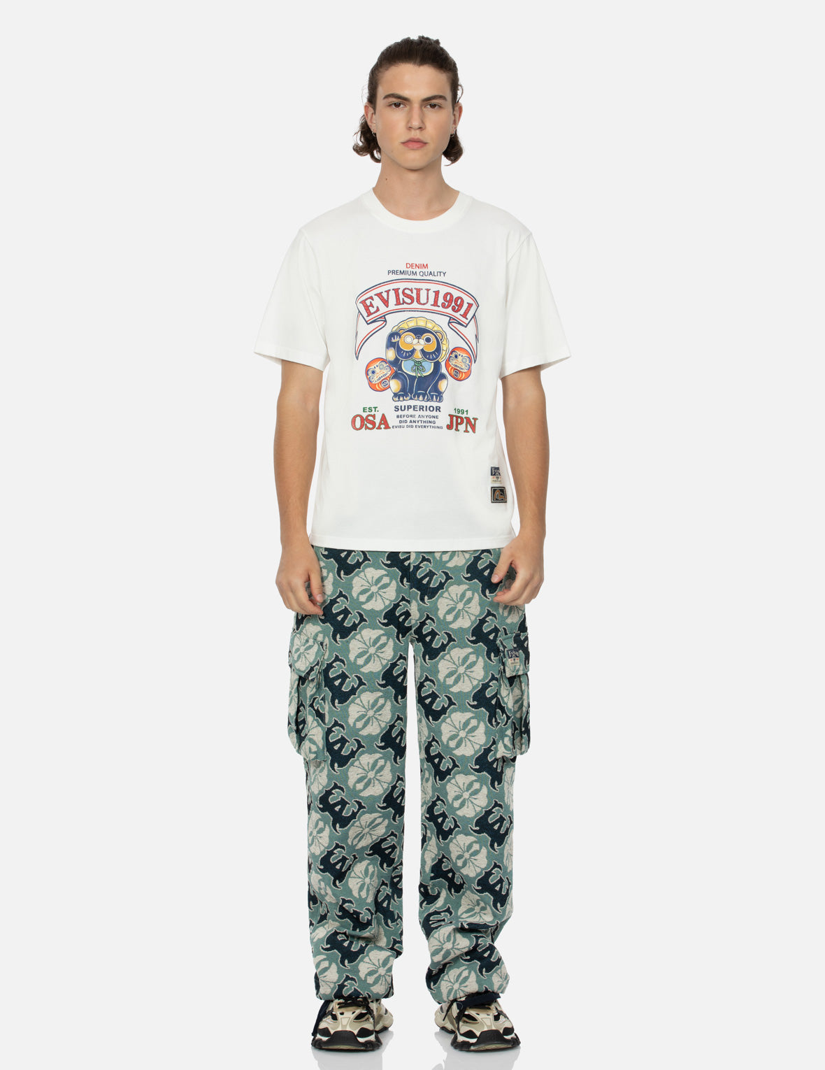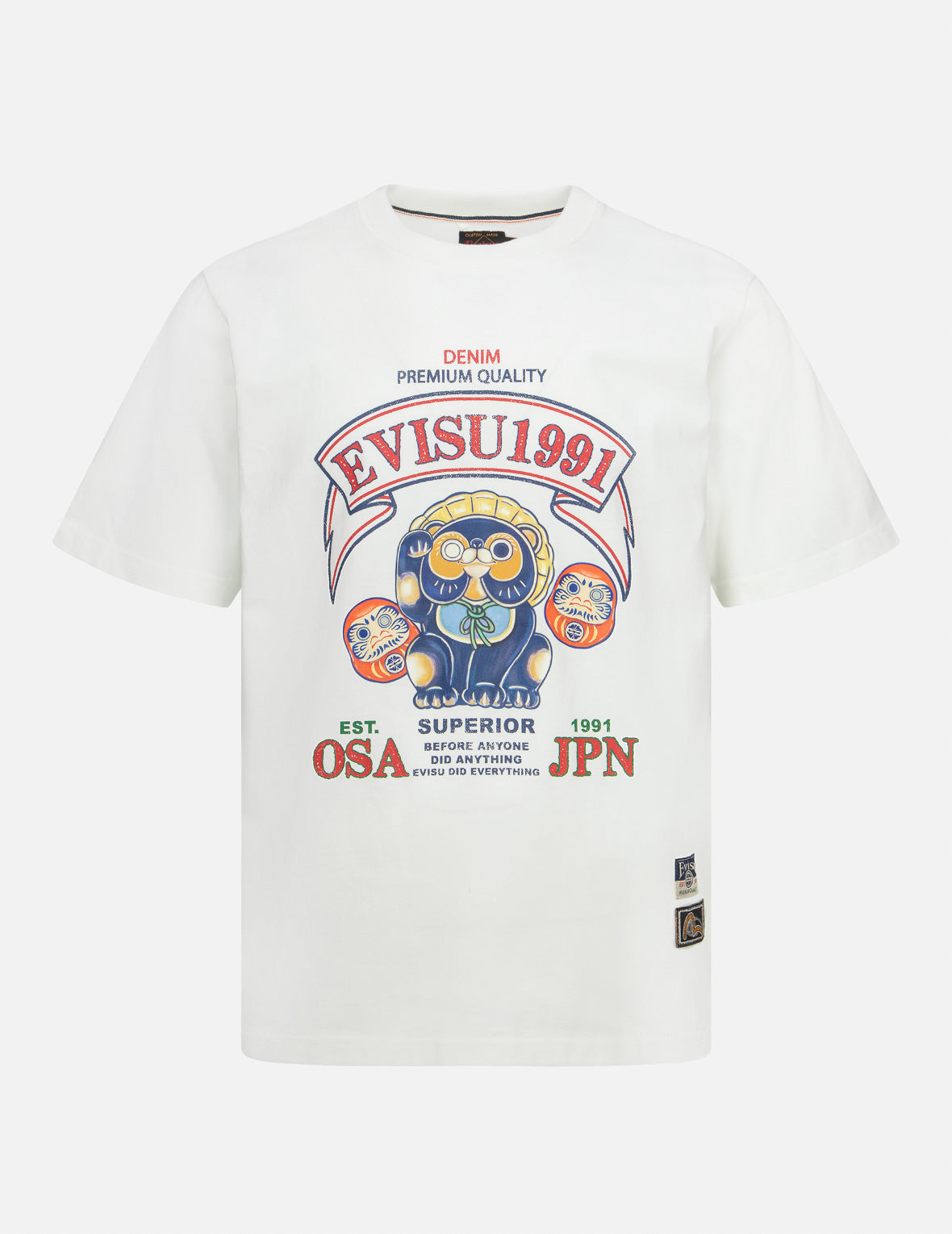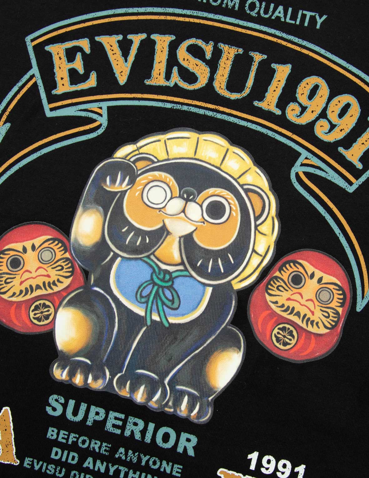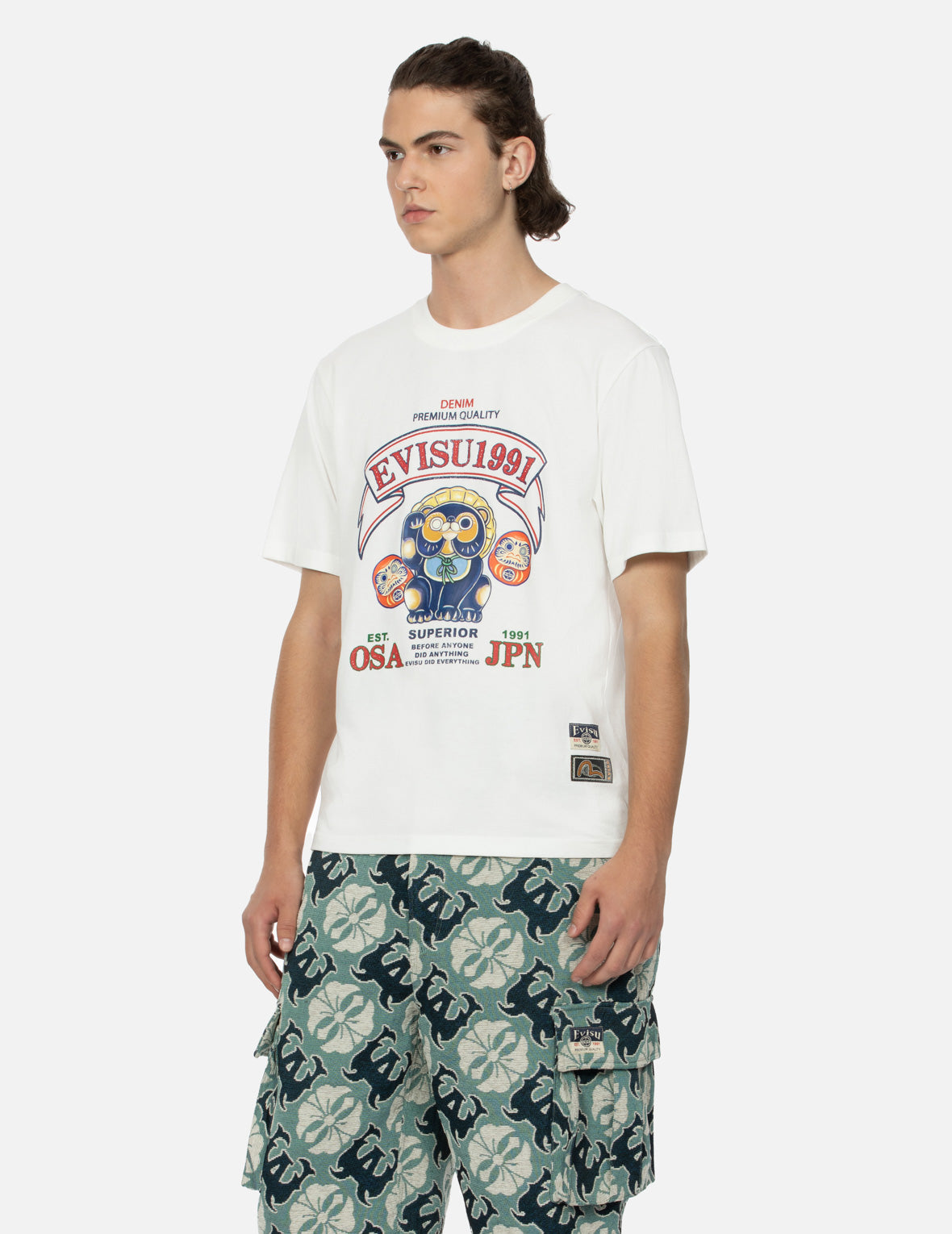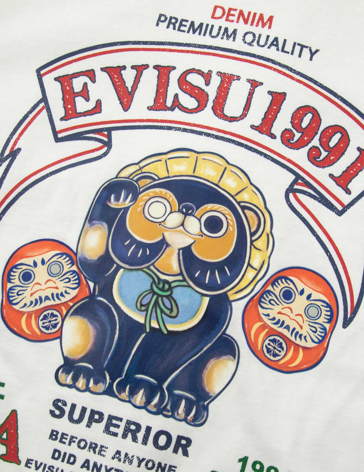 Adorning the EVISU T-shirt is a playful depiction of the Shigaraki tanuki and a Daruma print on the front, seamlessly combined with the brand logo and slogan, collectively resulting in a dynamic and colorful representation of EVISU's distinctive brand identity.