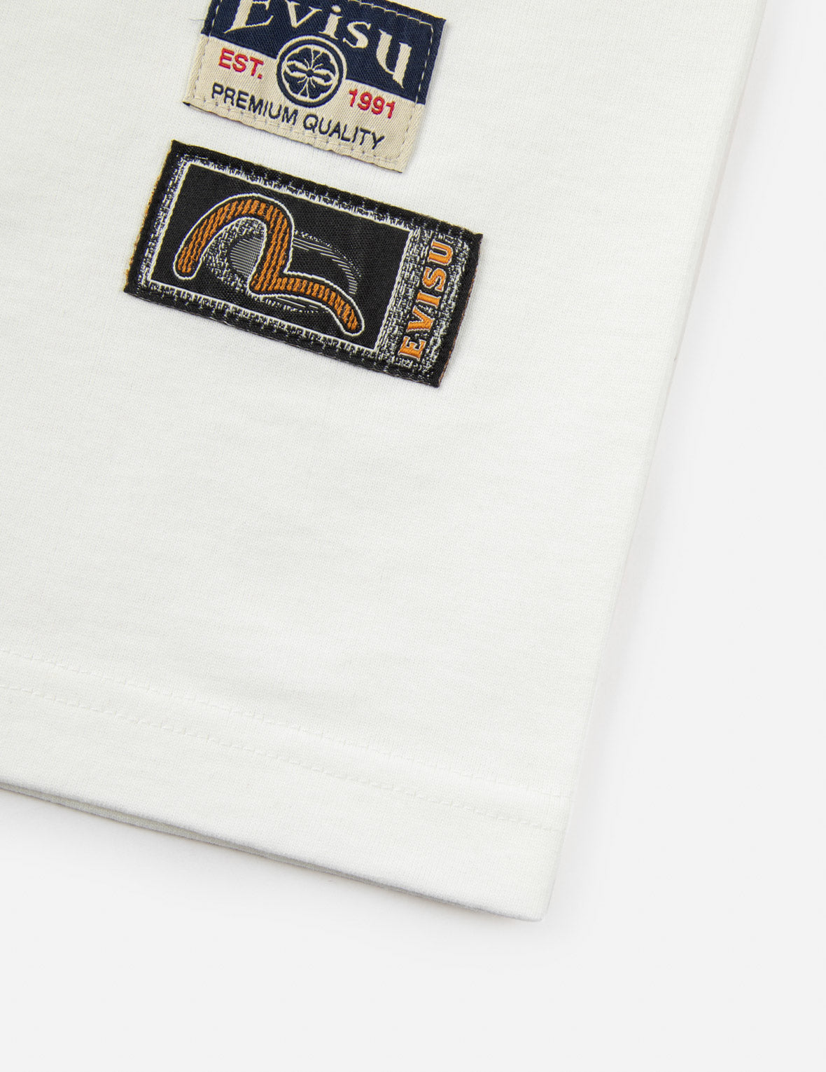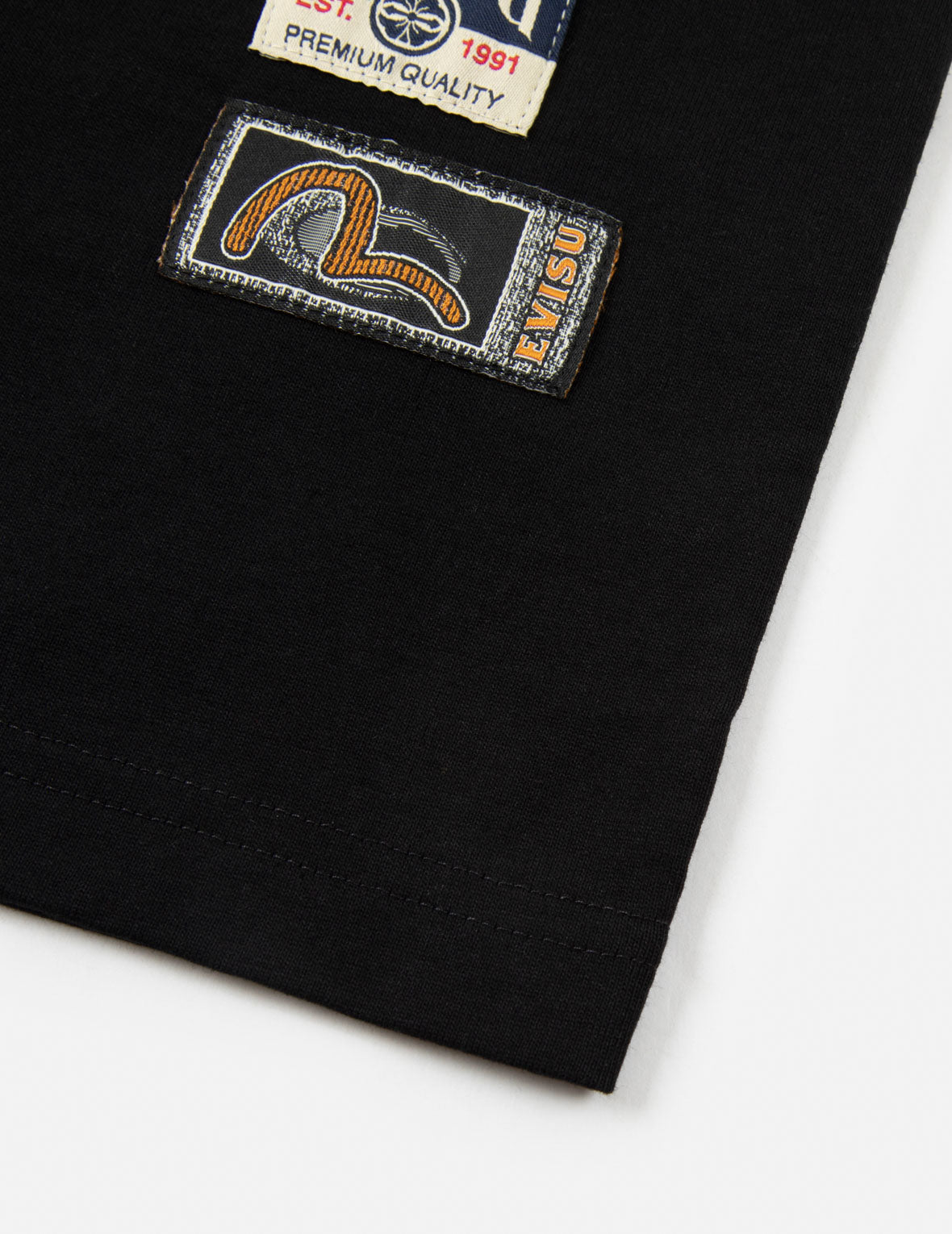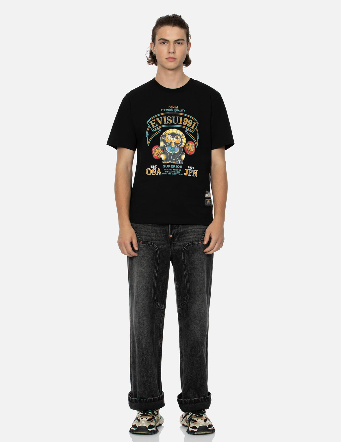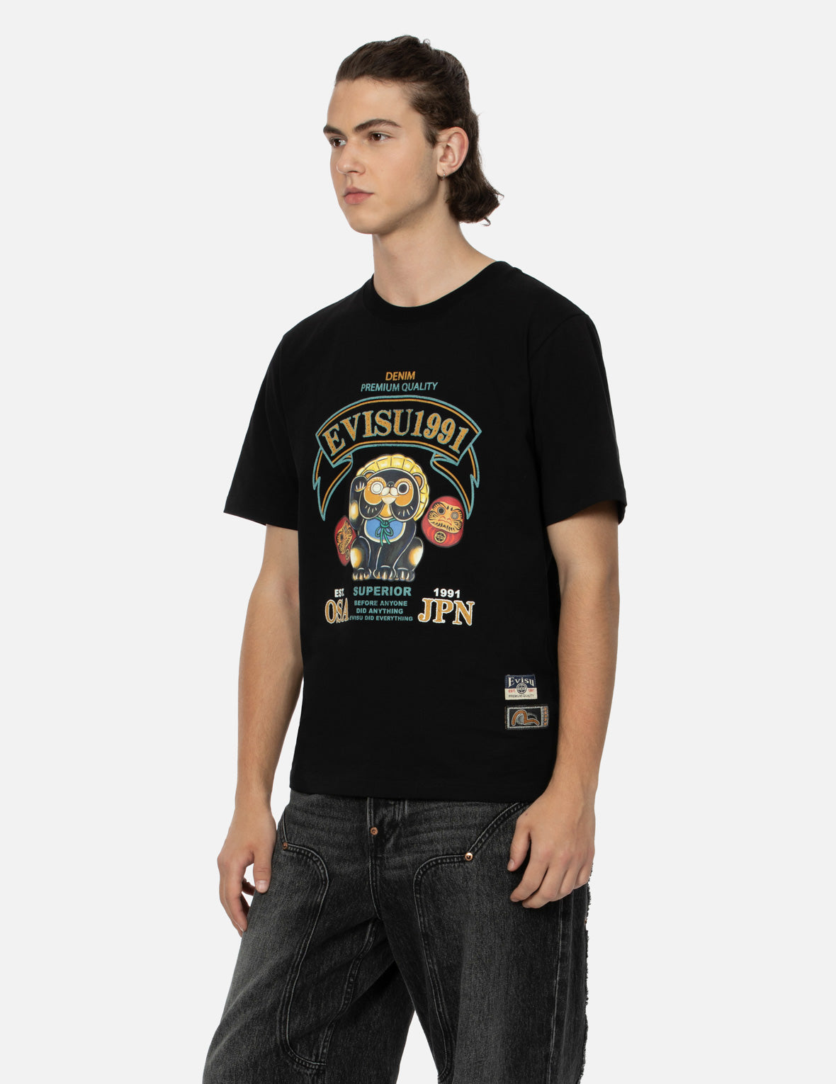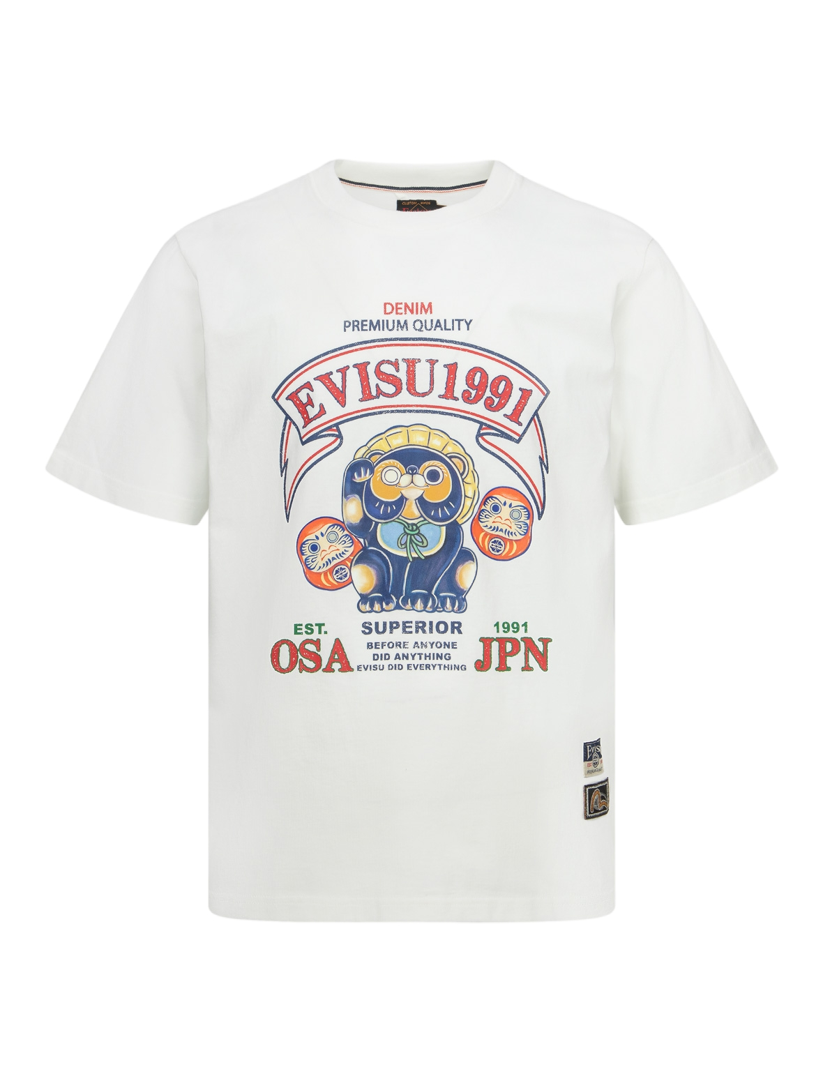 Adorning the EVISU T-shirt is a playful depiction of the Shigaraki tanuki and a Daruma print on the front, seamlessly combined with the brand logo and slogan, collectively resulting in a dynamic and colorful representation of EVISU's distinctive brand identity.
