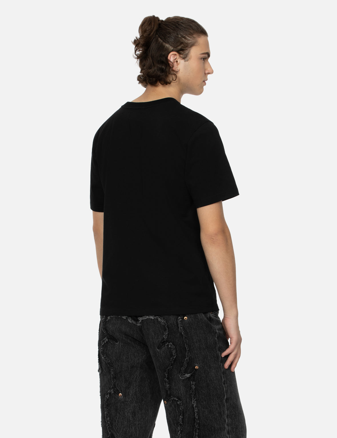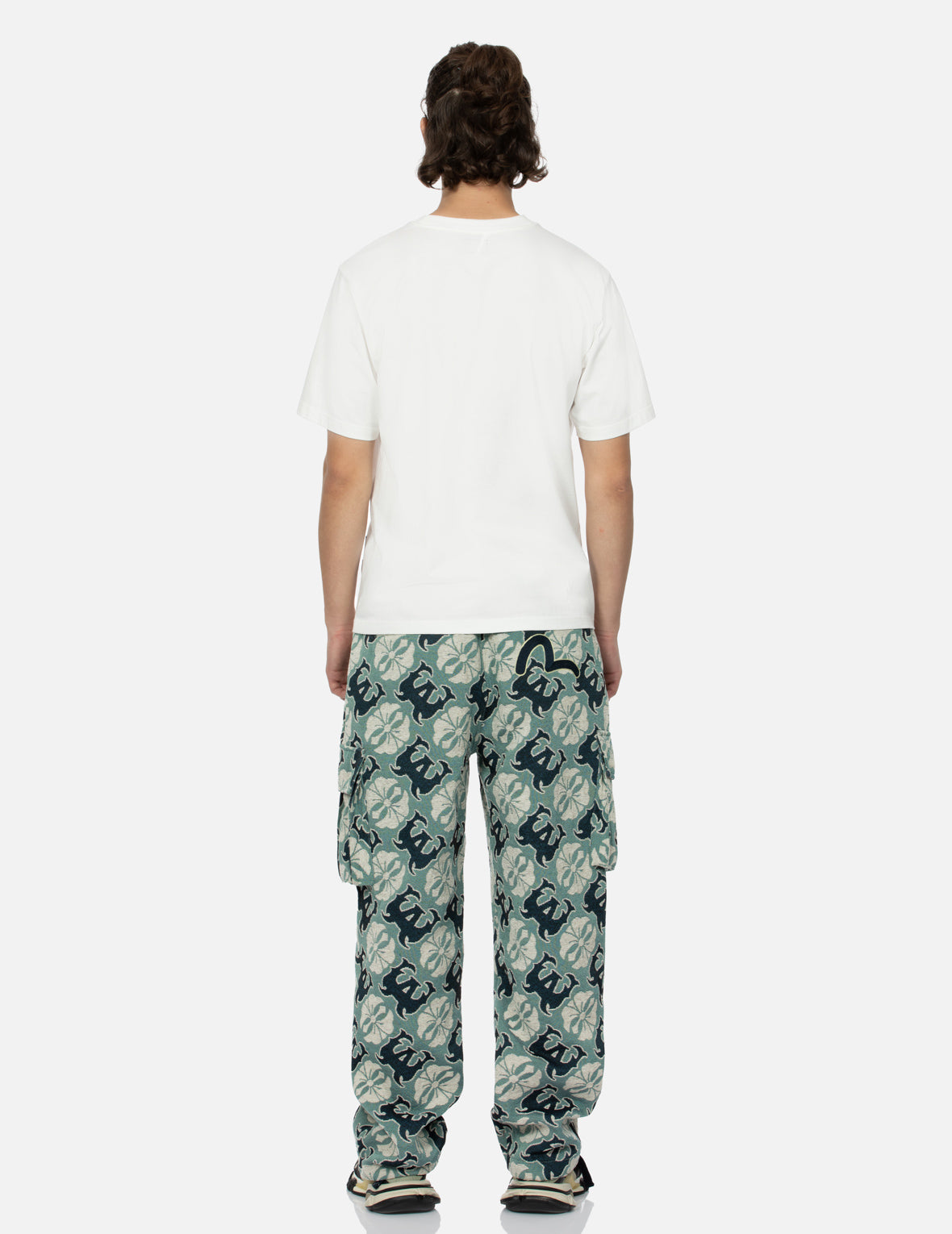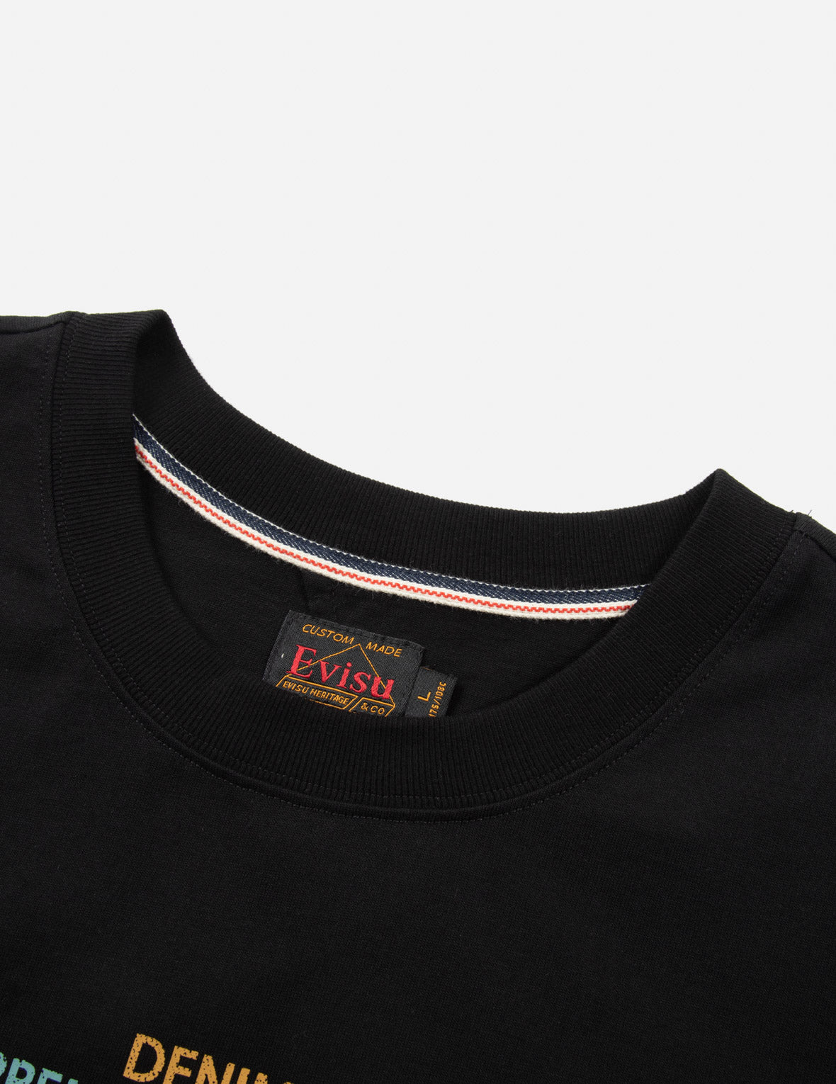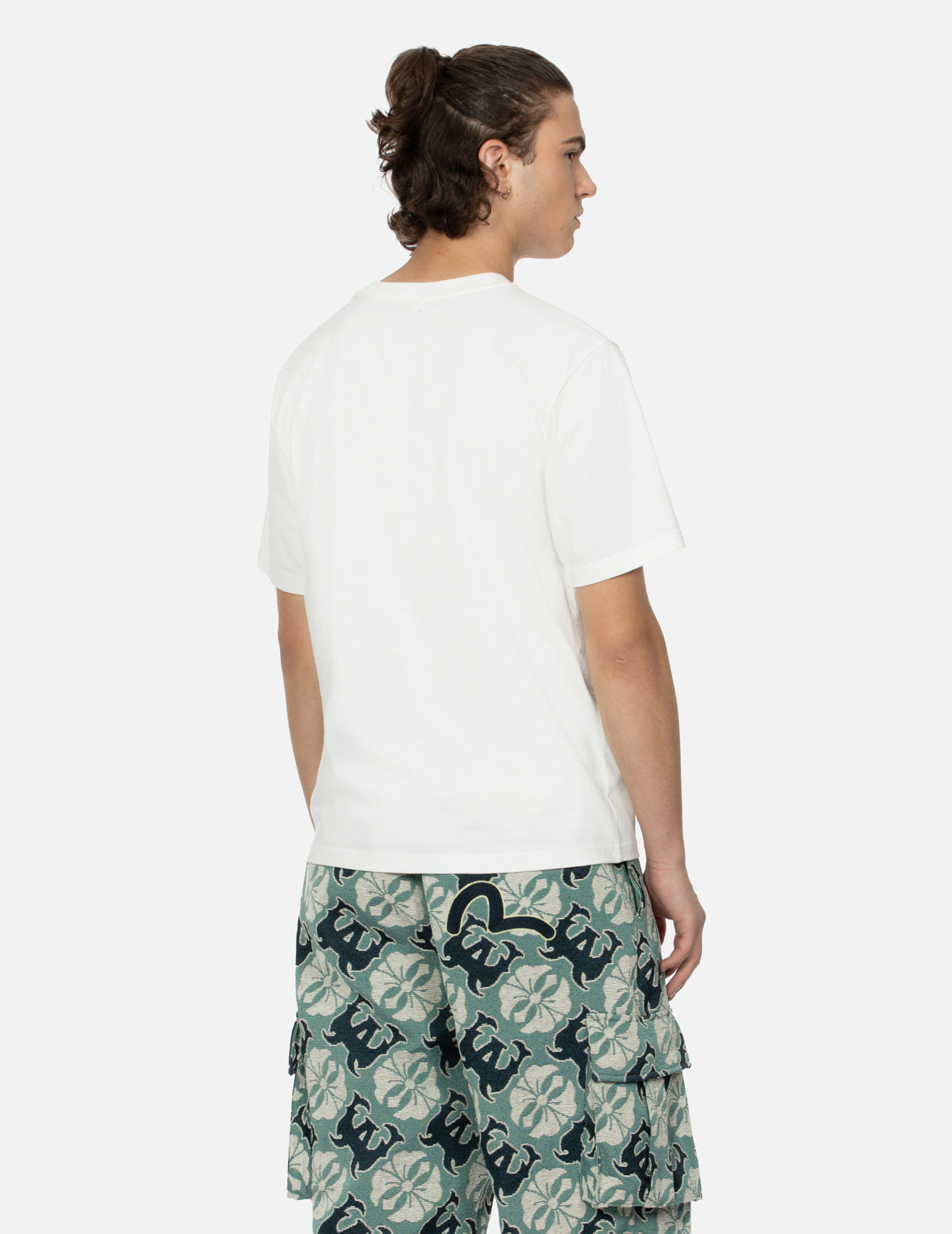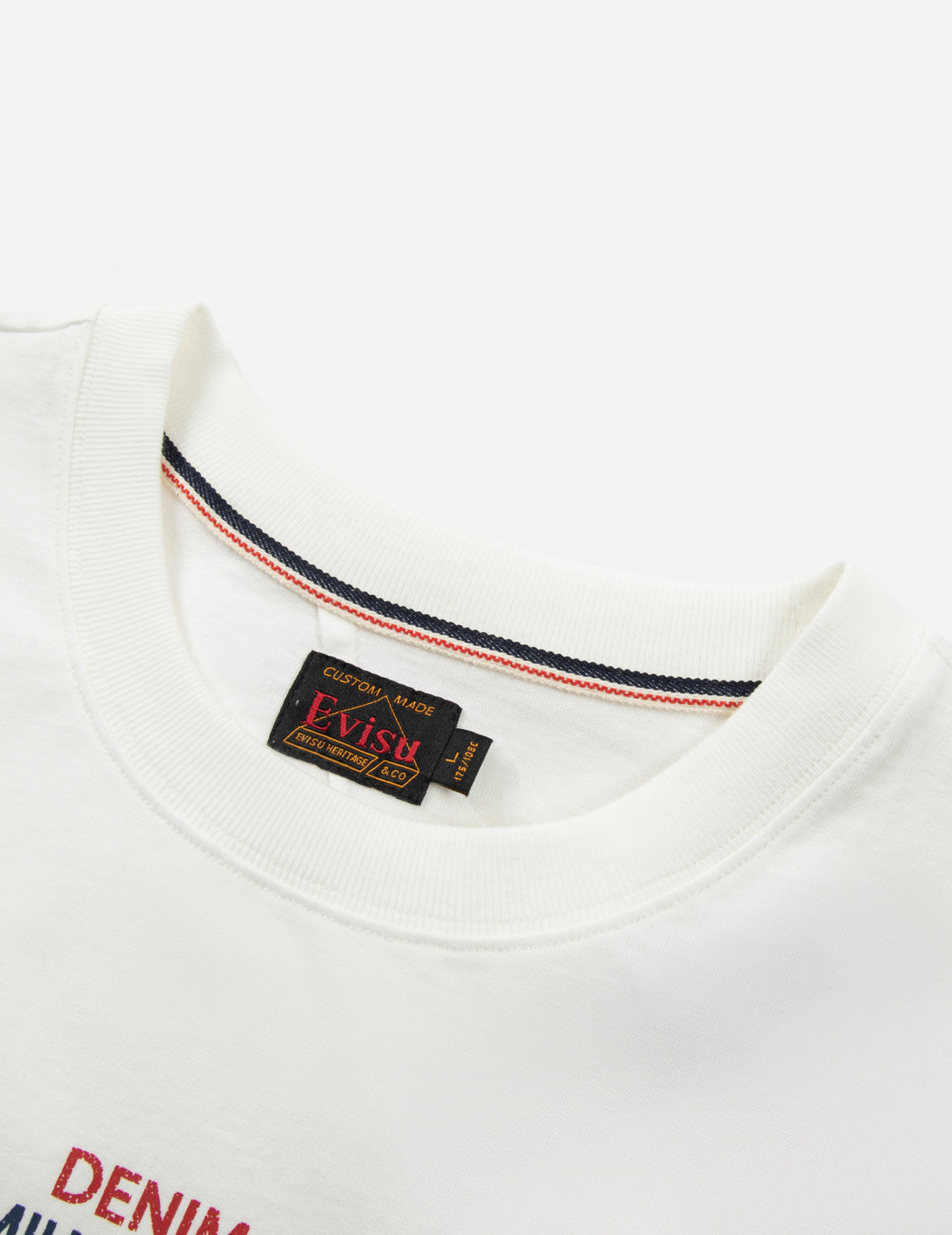Adorning the EVISU T-shirt is a playful depiction of the Shigaraki tanuki and a Daruma print on the front, seamlessly combined with the brand logo and slogan, collectively resulting in a dynamic and colorful representation of EVISU's distinctive brand identity.