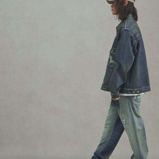 這款前衛牛仔褲以大膽的設計語言重塑街頭時尚!採用7口袋設計,褲身精工打造的破損細節,展現隨性不羈的叛逆風采。破損處點綴的海鷗刺繡點亮兩個口袋,增添獨特藝術感,瞬間提升整體造型。洗水工藝帶來自然磨損的復古藍調,搭配深淺漸層的色澤,演繹隨性與高級並存的穿搭態度。袋口以搶眼的紅色與藍色手工縫線點綴,帶來強烈視覺衝擊,展現匠心獨具的時尚細節。